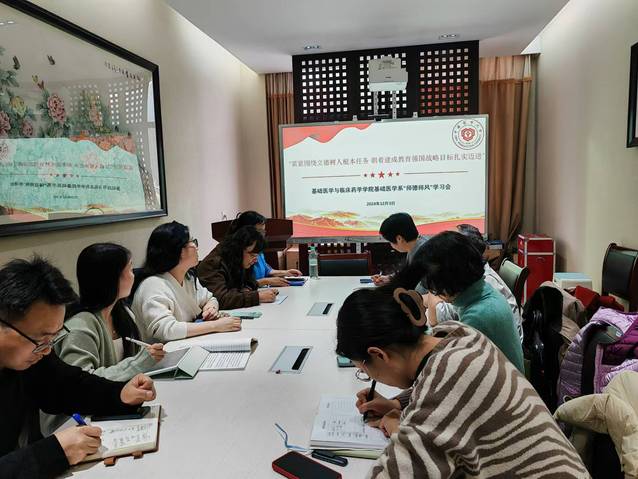 12月3日下午,基础医学系举办“紧紧围绕立德树人根本任务 朝着建成教育强国战略目标扎实迈进”为主题的“师德师风”学习会,对习近平总书记提出的“中国特有的教育家精神”,以及“新时代高校教师职业行为十项准则”进行深入学习。