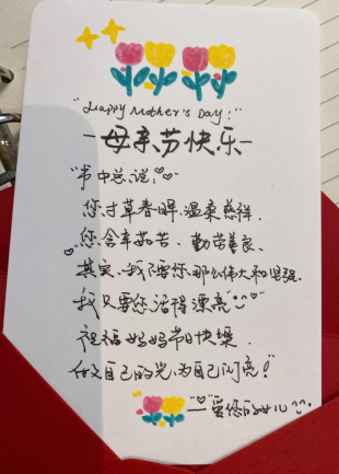 活动期间,社区学子以多元形式表达感恩之情。有的同学精心准备手写贺卡与定制花束,将承载心意的节日祝福寄送给家人;有的同学返回家中开展“一日母亲”角色体验,通过操持家务、照料家人,切身感受母爱的无私付出。此次活动同步开设线上“亲情时光馆”,通过征集母亲的老照片、家书等,以云端分享让思念跨越地域阻隔。