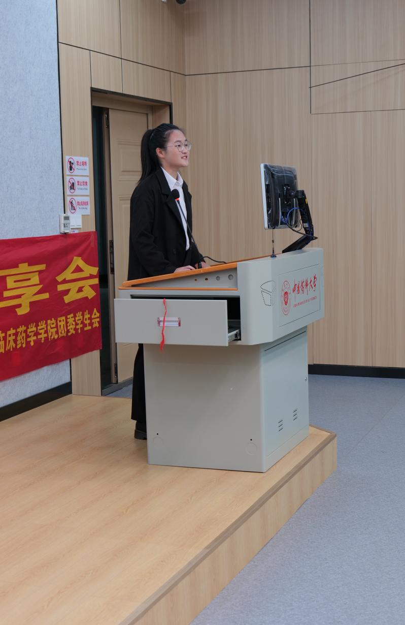 分享会上,2021级临床药学专业本科生朱梦圆同学结合自身经历用真诚和质朴的语言从“诚信、感恩、励志”三方面展开分享,详细介绍了公司的资助相关政策,重点讲述了诚信在学习科研、生活交往、评奖评优等各方面的重要体现。同时,结合自身获得国家奖学金和学习标兵荣誉称号的经历和感受鼓励大一新生常怀感恩之心,以积极的态度去适应大学的生活,勤奋学习,勇于担当。现场同学们认真倾听,积极互动交流。