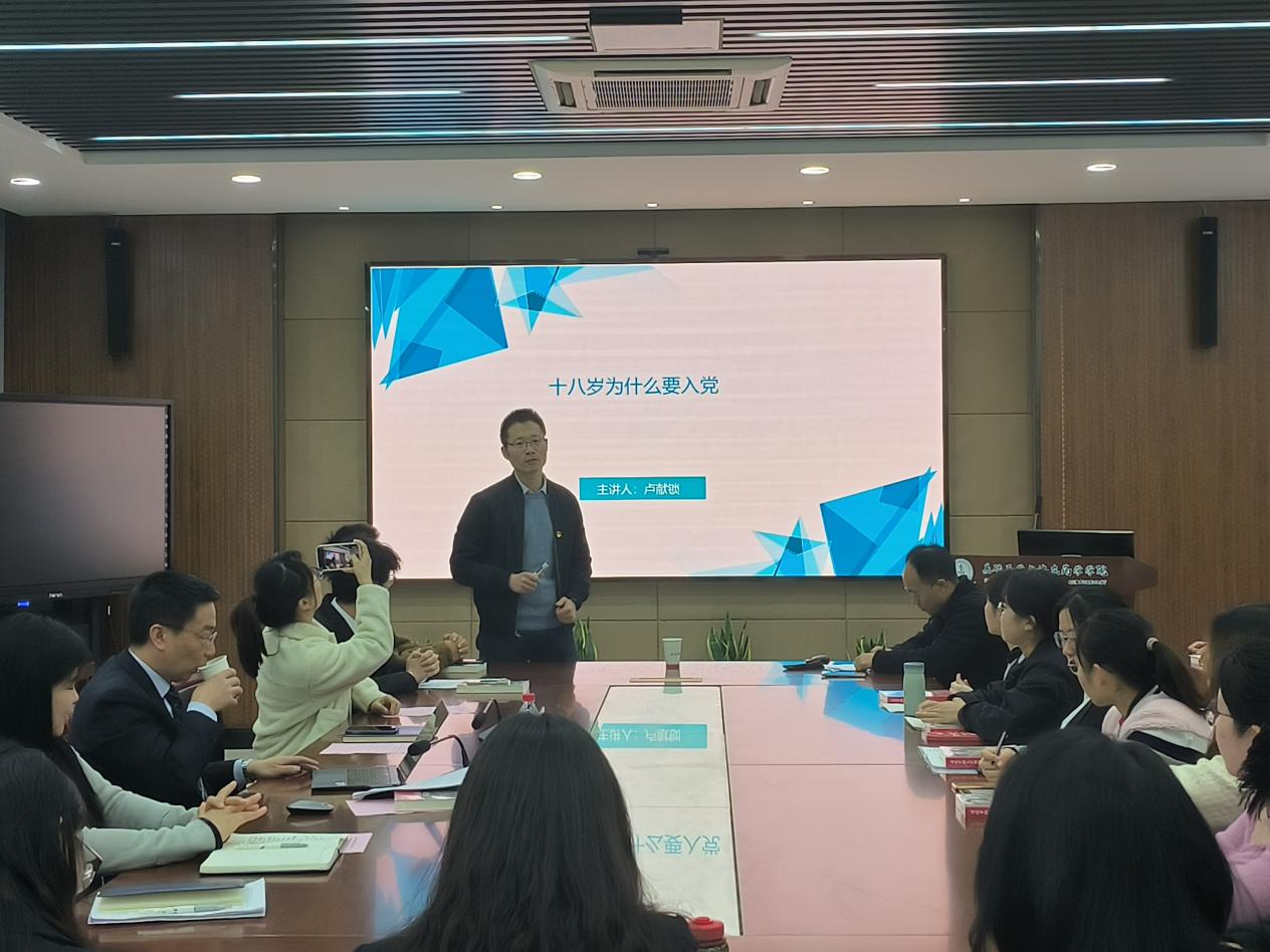 员工工作处(部)、研究生工作部副处(部)长卢献锁在《十八岁为什么入党》专题报告中,介绍了孔子、孙中山、毛泽东、习近平等伟人的成长故事,重点分享习近平总书记在青年岁月立志、读书、交友、做事的感人事迹,向同学们提出了十八岁“立什么志”、“读什么书”、“交什么友”、“做什么事”等思考题。专题党课引经据典、案例丰富,具有较强的启发性、针对性,引发学员强烈共鸣。