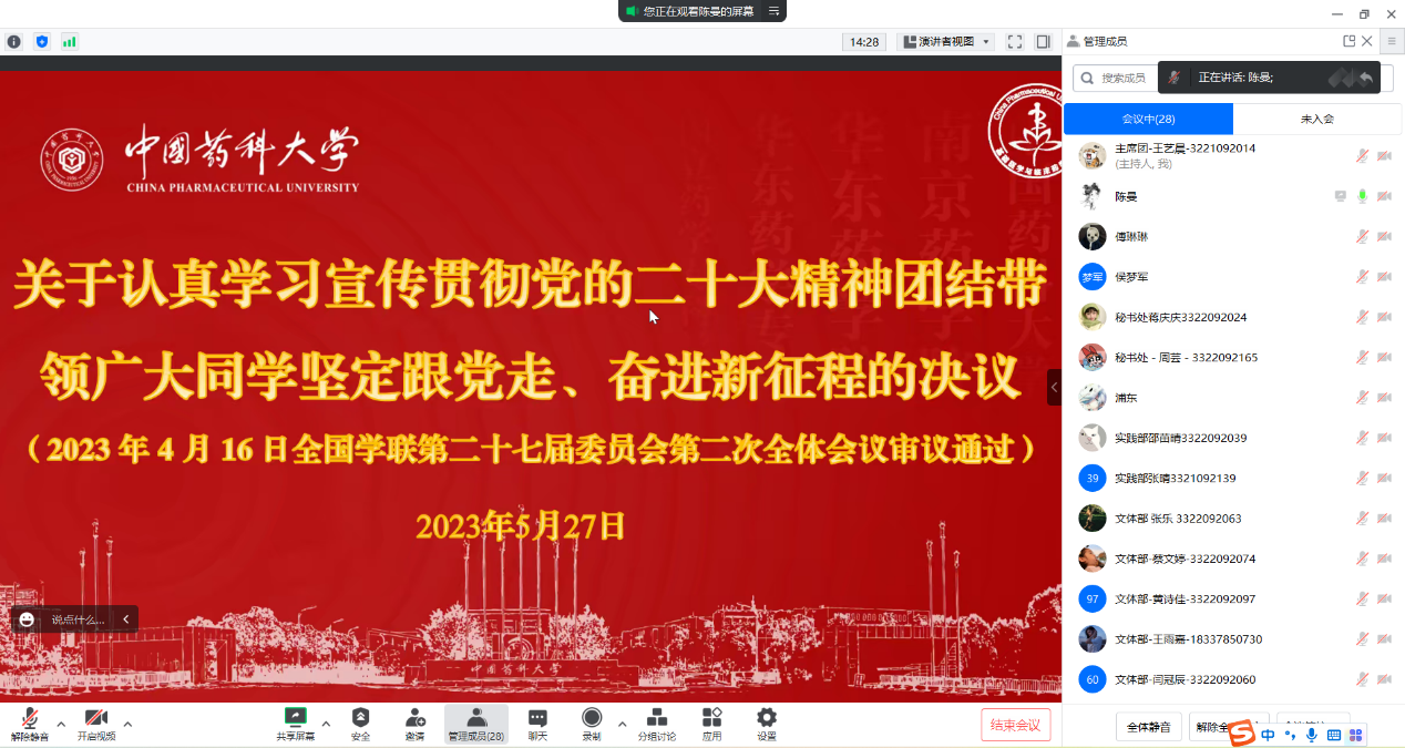 公司研究生会主席团成员王艺晨根据《关于认真学习宣传贯彻党的二十大精神团结带领广大同学坚定跟党走、奋进新征程的决议》传达了学联员工会组织团结带领广大同学学习党的二十大精神、坚定跟党走、奋进新征程的研究部署,就《认真学习宣传贯彻党的二十大精神团结带领广大同学坚定跟党走、奋进新征程——全国学联第二十七届委员会第二次全体会议在京召开》和《在全国学联第二十七届委员会第二次全体会议上的工作报告》进一步展开学习讨论。研究生会主席团成员回顾梳理了全国学联二十七大召开以来,在公司团委指导下组织开展的系列工作,进一步明确了下一步研究生会组织持续深化改革、完善体制建设的主要任务和工作内容。