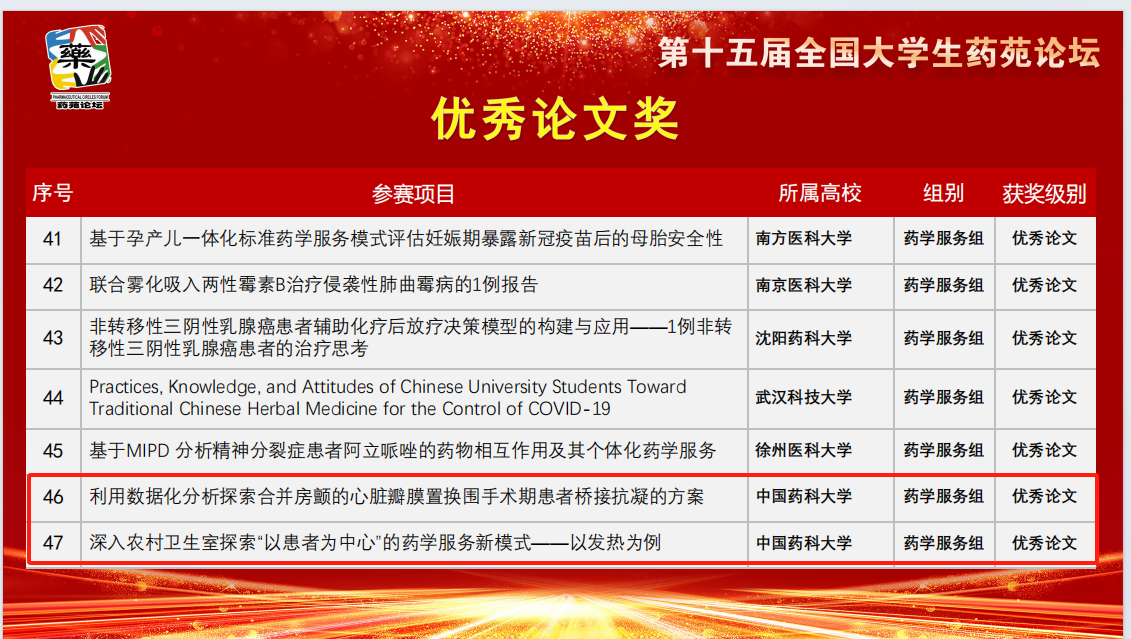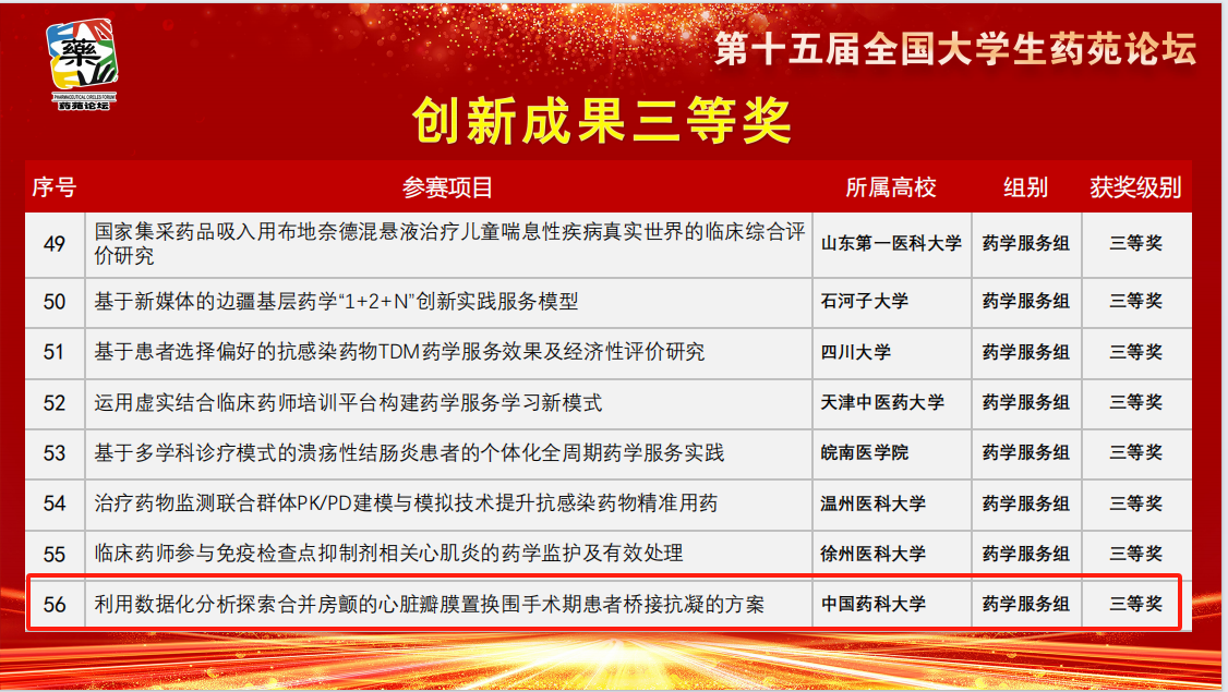 10月18-20日,由全国药学类院校专业技术与实验技能竞赛组委会主办,沈阳药科大学承办的第十五届“全国老员工药苑论坛”在沈阳药科大学隆重举行。本次论坛设立“药学科学”和“药学服务”两个子论坛,共收到论文237篇、壁报展示作品230项、创新成果评选作品247项。论坛设创新成果特等奖3项、创新成果一等奖22项、创新成果二等奖37项、创新成果三等奖56项、优秀论文奖47项、优秀壁报奖20项。公司师生参赛项目“深入农村卫生室探索‘以患者为中心’的药学服务新模式——以发热为例”获优秀论文奖和创新成果二等奖,“利用数据化分析探索合并房颤的心脏瓣膜置换围手术期患者桥接抗凝的方案”获优秀论文奖和创新成果三等奖。