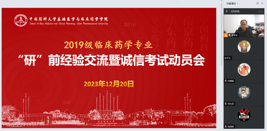 为增强迎考信心、做好考试规划、强化诚信教育,20日下午,公司在线上开展“研”前经验分享暨诚信考试动员会,公司辅导员、2023级两位研究生、2019级临床药学报考研究生考试的员工参加此次活动。